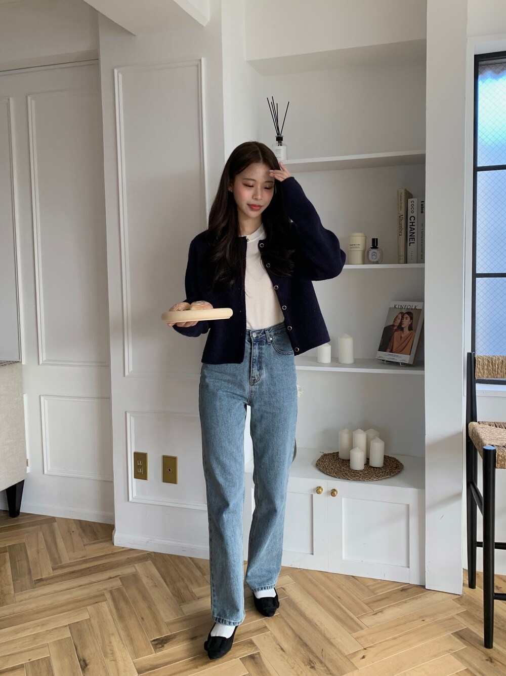黒いボタンがビンテージっぽくて可愛いカーディガン🤍 outer : 🏷 classy knit cardigan / navy top : 🏷 citrus wool blend long tee / ivory pants : 🏷 waggy denim shoes :🏷 been flat pumps Instagram @ddafm.en mood for a day @moodforaday_official