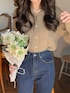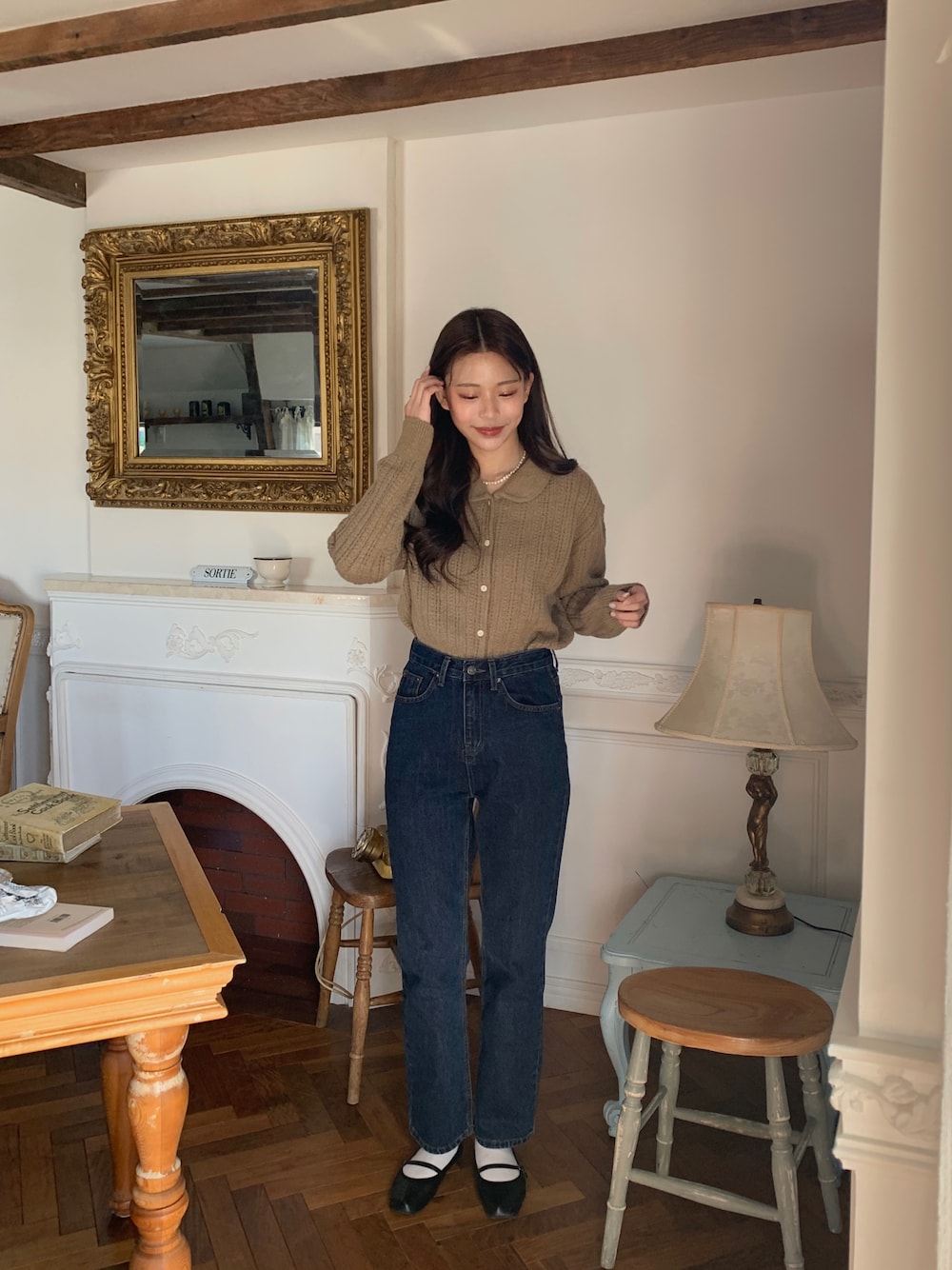 編み方が可愛いニット🧸🤍 top : 🏷 lollia cardigan / brown pants : 🏷 century denim pants shoes :🏷 bailey strap shoes / black bag : 🏷 stroll suede boston bag / black Instagram @ddafm.en mood for a day @moodforaday_official