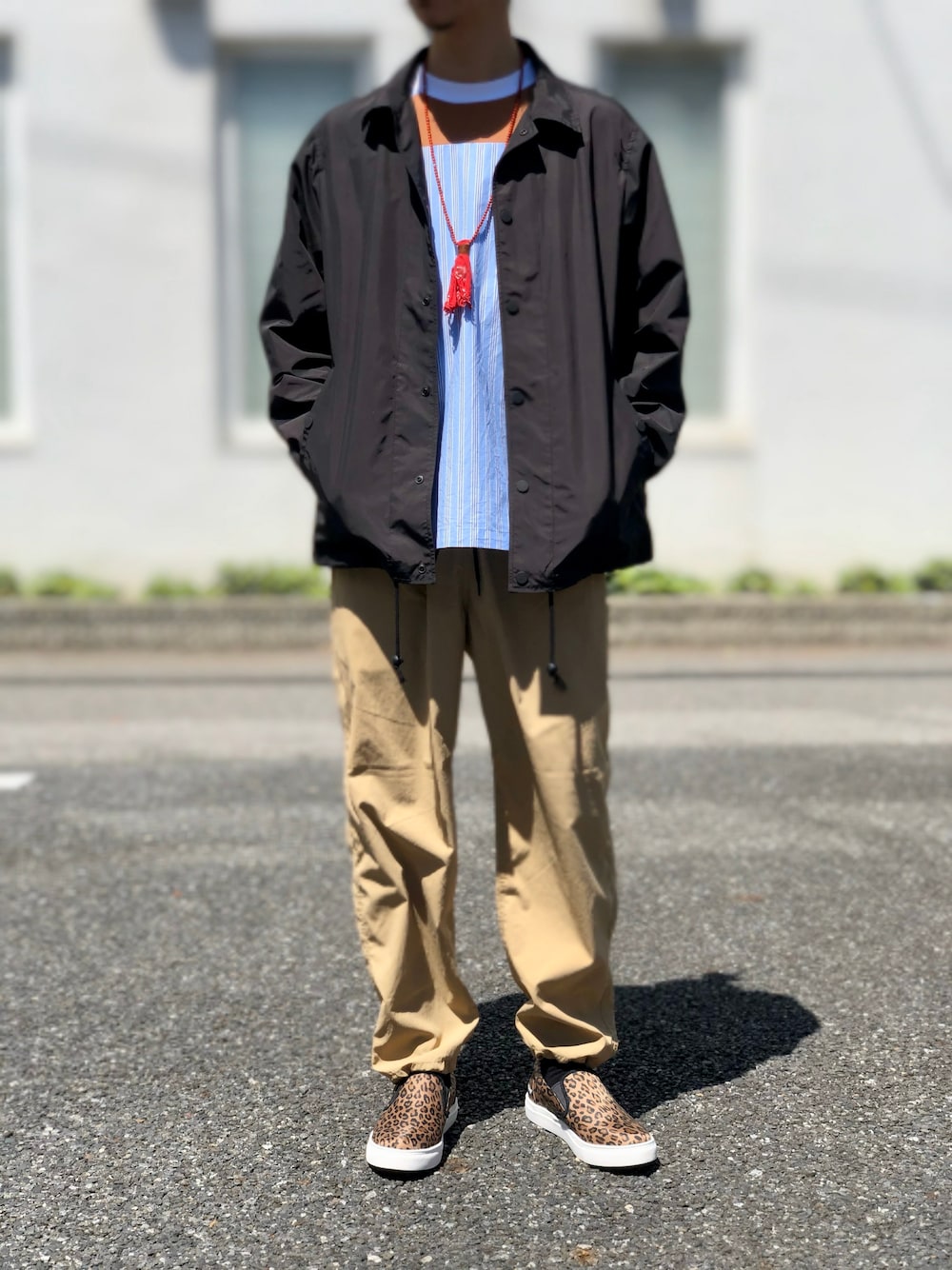 White Mountaineering ジャケット PRINTED COACH JACKET 33,000+tax T シャツ STRIPE CONTRASTED T-SHIRT 20,000+tax シューズ PERTEX SHIELD PRO LEOPARD PRINTED SLIP-ON 24,000+tax MIKIA ネックレス Necklace / Suede Bandana (CORAL) 17,000+tax STANDARD CALIFORNIA パンツ SD Comfortable Easy Pants Ver 2.0 14,800+tax