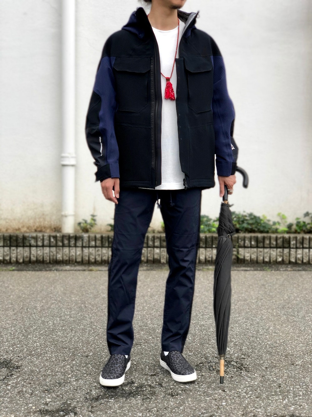 White Mountaineering ジャケット GORE-TEX CONTRASTED HOODED PARKA 106,000+tax シューズ PERTEX SHIELD PRO LEOPARD PRINTED SLIP-ON 24,000+tax Wardrobe/White Mountaineering T シャツ OVERSIZED T-SHIRT 8,000+tax パンツ SLIM JOGGER PANTS 19,000+tax MIKIA ネックレス Necklace / Suede Bandana (CORAL) 17,000+tax