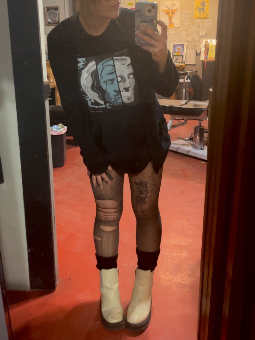 Band Tshirt and black Cardigan over tights, knee socks, and white, ink-stained Chelsea boots. I always wear “action pants” when I wear short outfits like this. That way, I’m always ready for action! That would be some form of hot pants, bloomers, or yoga shorts, so there is no fear of indecency while kicking someone in the face and cartwheeling away.