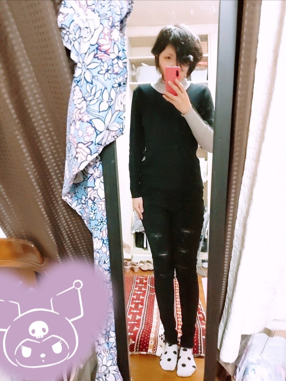 上手く服のとこにタグ入ってくれない笑。 SHEINコーデ。 トップスのセーターは実は真っ黒ではなく バックスタイルはグレーというデザイン!