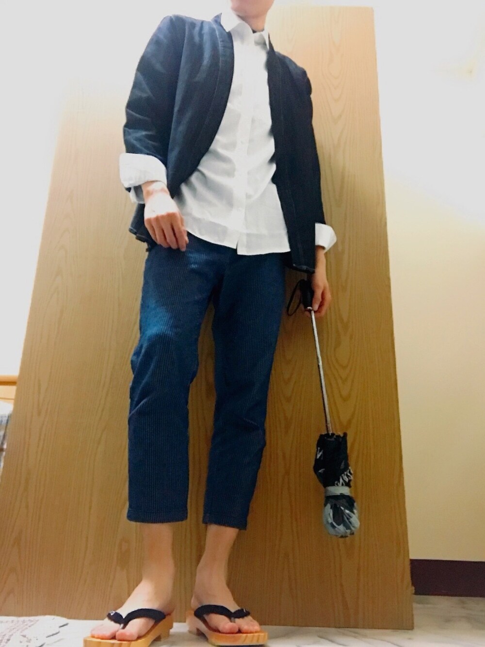 雨天穿搭 夾腳拖型木屐 九分褲 和服牛仔外套 貫穿完成 雨天的日式穿搭 2018 冬 雨