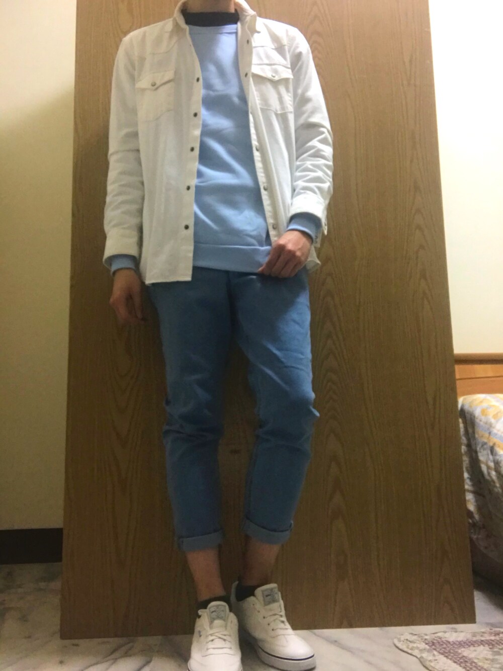 藍白色系穿搭 嘗試過各種藍色之後 發現淡藍色系與白色的組合 意外好看 因此選用顏色呼應的搭法 袖子的部分特別拉出來製造層次 最裡面內搭一件黑色微高領發熱衣 整體就能看起來乾淨又舒服 2018 冬