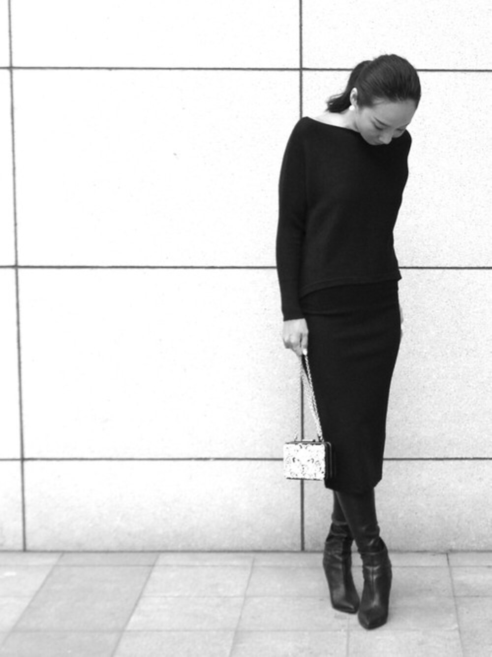 https://decanta.stores.jp 在庫あります♡ カジュアルすぎない全身キレイ目なデイリーコーデ。 ドルマンが小さめなので、タイトなスカートと クラッチバッグを合わせればモードな雰囲気に。