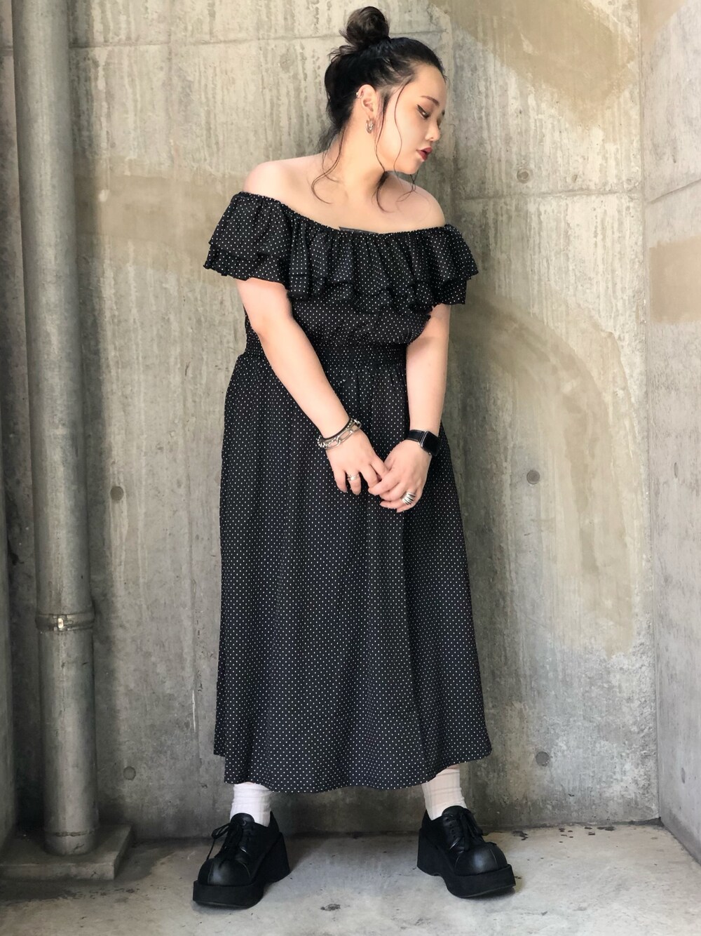 キサキのワンピース「ドット柄オフショルワンピ-ス」を使ったコーディネート