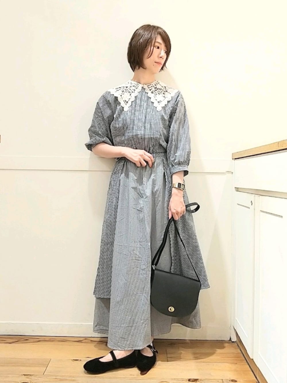 つけ襟でよりレトロに!スカートの位置でも印象が異なります(*^^*)トップスはインしても出してもかわいいです♪ダブルフロントなので着回し自由!