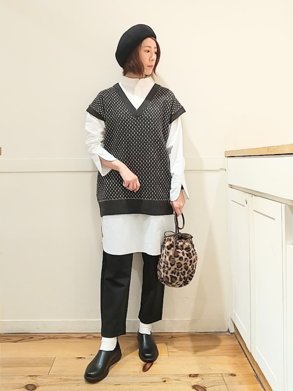 モノトーンで落ち着いているのでレオパードが映えます♪ 小物のレオパードば取り入れやすいのでオススメです。