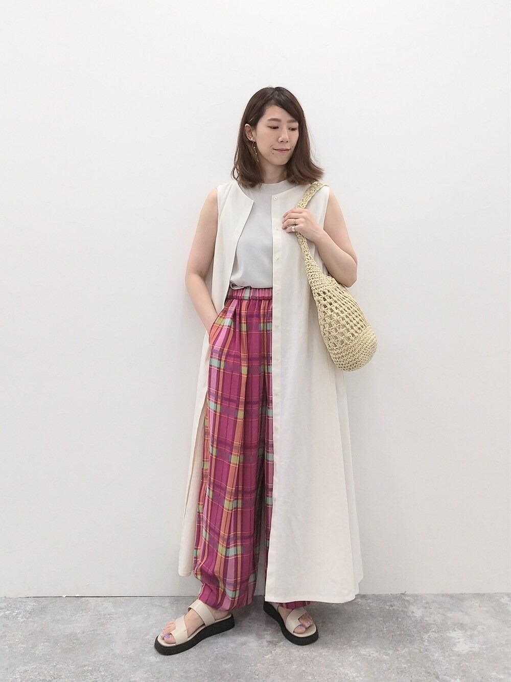 ご覧いただきありがとうございます。 柄物はいつもきないという方もロング丈と合わせると安心感が出ます! ワンピースはボタンを開けてジレのようにも着ていただけます♪