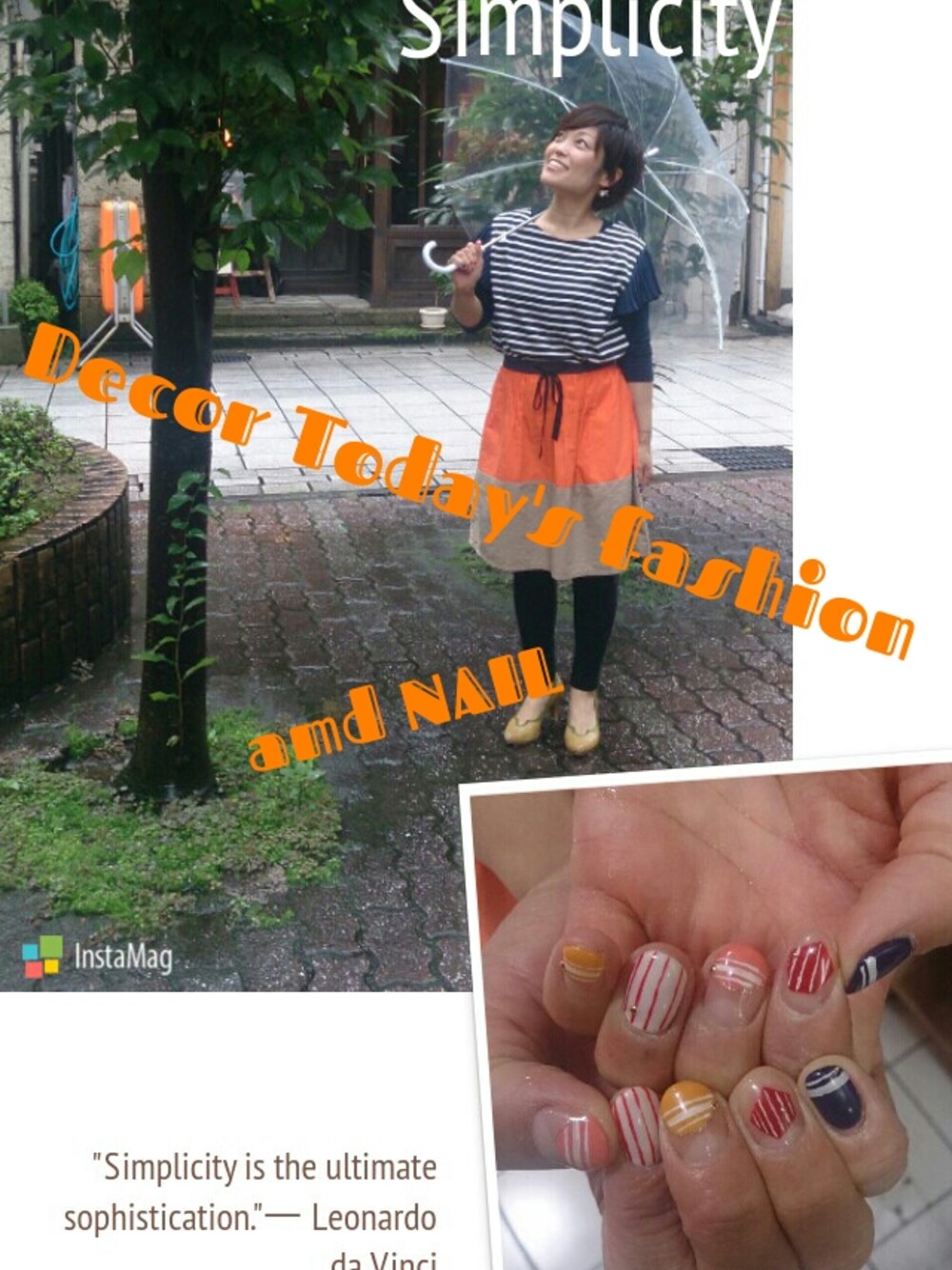 雨の日でもポップに♪ オレンジのスカートがアクセント!!!ボーダーで夏らしさも。 ヘアスタイルはショート!!! パーマで遊びもプラス☆ ネイルもポップな感じで!!!