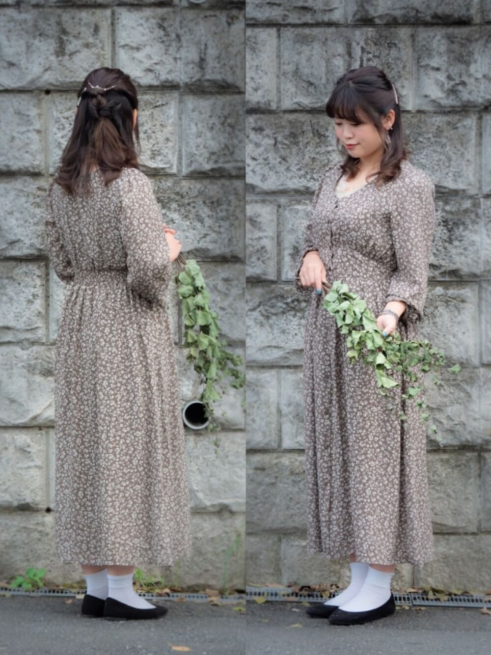 ヴィンテージライクなフラワープリント🌼*・ 落ち着いたブラウンに優しい白のみの花柄なので、羽織やインナーで印象が変わるのも魅力◎ ウエスト切り替えのエンパイアラインが、脚長見え効果も期待できます(嬉しい!) 首のデコルテも綺麗に見えるので、これからの時期、タートルネック等ともレイヤードするのが楽しみです🌱