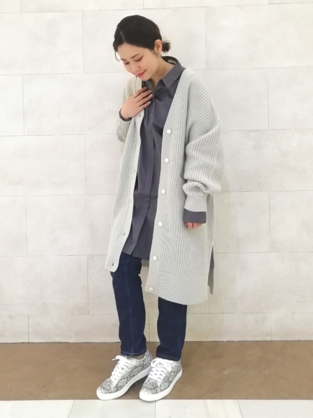グレートーンコーディネート♪ シックなチャコールグレーのシャツに、 デニムとカーディガンを合わせた 王道カジュアルコーディネート👖✨ 全体をモノトーン調に合わせつつ、 スニーカーはパイソン柄をチョイスでオシャレ度アップ🐍
