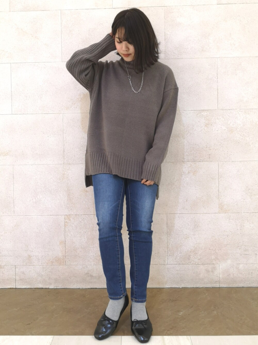 シックなチャコールグレーニット🦝 伸縮率の高いスキニーデニムと、 シルバーアクセサリーで大人ムードをプラス◎ バレエシューズは春の新作🌸 足元から新しい空気をぜひ!
