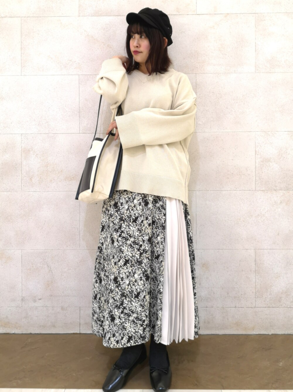 モノトーン映えるフェミニンコーデ🐼 Vネックニットで首元はすっきり♪ なのに、袖はほんのすこしの広がりのあるこなれデザイン! シンプルながらもデザインがギュッと集まったニット◎ 合わせたスカートは部分プリーツが大人可愛い💓 エレガントな小花柄も春らしく、 白黒なので甘すぎず合わせて頂けます! 小物も落ち着くブラックをCHOICE! おすすめふかふかソールのバレエシューズです♪ Instagram>>>>@dedede18_ フォローコメントお待ちしております🌼*・