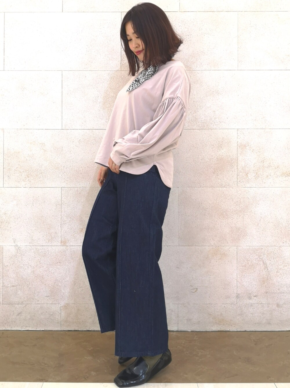 くすみピンクが大人可愛い🌸 センタータックが入った脚長効果抜群のデニムと、 ヒョウ柄スカーフを合わせて、 可愛いけど大人っぽいこなれ感をプラス! パンツスタイルだけど格好よすぎない! ちょうど良い甘さのコーディネートに♪