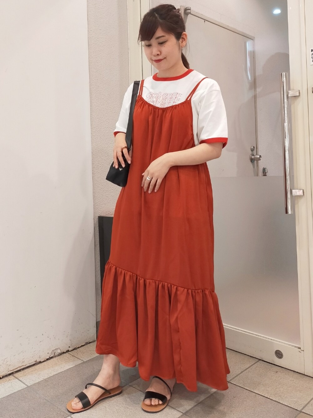 赤が目を引く大人可愛いキャミワンピコーデ🍎 *キャミワンピース* ボリューム感のあるティアードデザインが、 歩く度ふわっと華やかに魅せるワンピース。 光沢のあるサテン素材が、ぐっと大人の魅力を演出◎ 肩紐は結ぶタイプなので調整もしやすく、 背中でクロスさせるのもおすすめです♪ *リンガーTシャツ* レトロ可愛いPEANUTSオリジナルアイテム! さり気なくデザインされたチャーリー・ブラウンが素敵♪ ……リンガーTシャツとは? 首や袖にパイピングが入ったTシャツのこと。 「輪」を意味する英語 “ring” から、 襟や袖口に輪状の厚みがあり、その部分に 差し色が入っているのが特徴です! *バッグ* 大人気アネロから、限定アイテムが登場◎ MICKEY&MINNIEデザインがとっても愛らしい! 撥水なので雨の日でも安心です♪