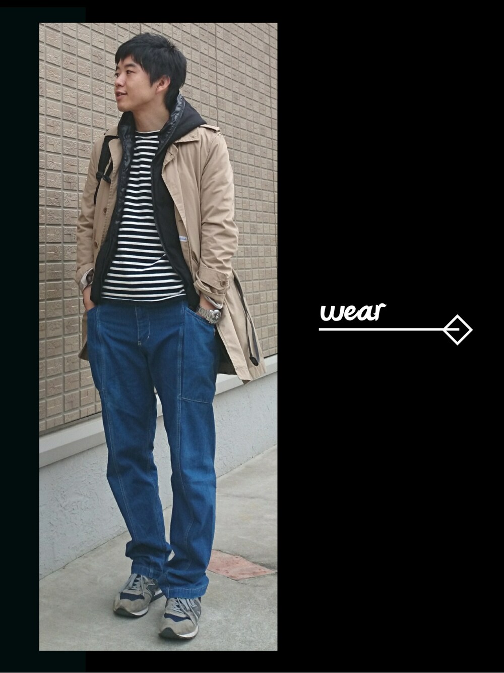 太めのジーンズには ステンカラーコートを合わせたい。 フードつきダウンベスト コートの下に着ると ほどよいボリューム感と 腕がスッキリしてとても良い☺