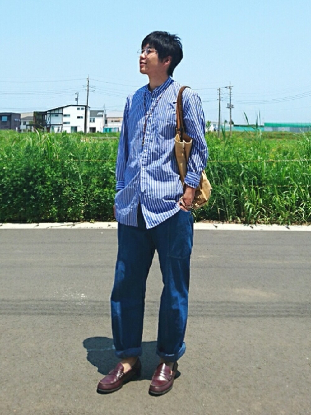 おはよーSunday☀ ロングシャツコーディネート ロングシャツには、ワイドパンツ 我が奥さまの主張👧 ネックレスは奥さまのを拝借 メガネとローファで、こなれ感を