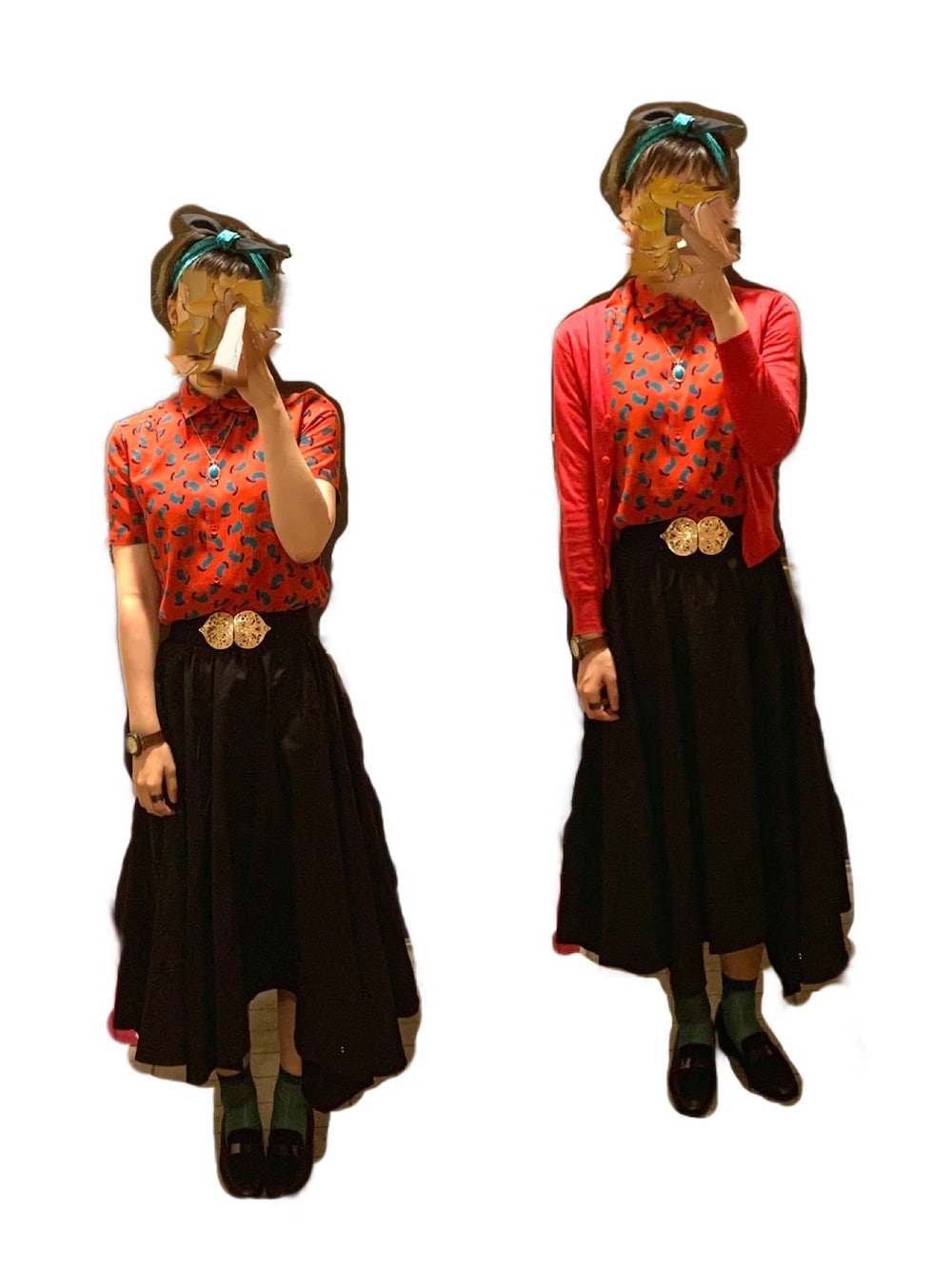 昭和レトロをイメージしました。 赤のシャツに赤のカーディガンを合わせましたがない方が夏らしくていいかもしれないです。