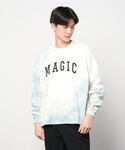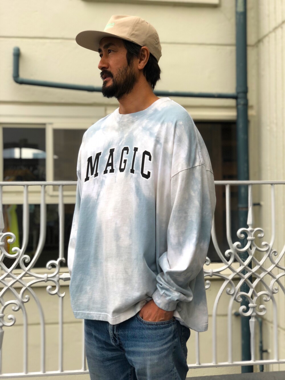 5.6 オンスの肌触りが良い天竺をタイダイ染めにした 1 着。 肩幅、身幅、アームホールはゆったり目、着丈はレギュラーのサイズ感になっており、特に太めのショーツやパンツとの相性がよくハマる。 タイダイ染めは大阪の職人達が一点一点染め加工を施し、独特のペールトーンで綺麗なブルーグレー染め上がった。 新しいカレッジロゴはアメカジ過ぎずシンプルにすっきりと、しかしその反面大きめの文字にする事でインパクトも持たせており、タイダイ染めとのメリハリを強調した一枚。