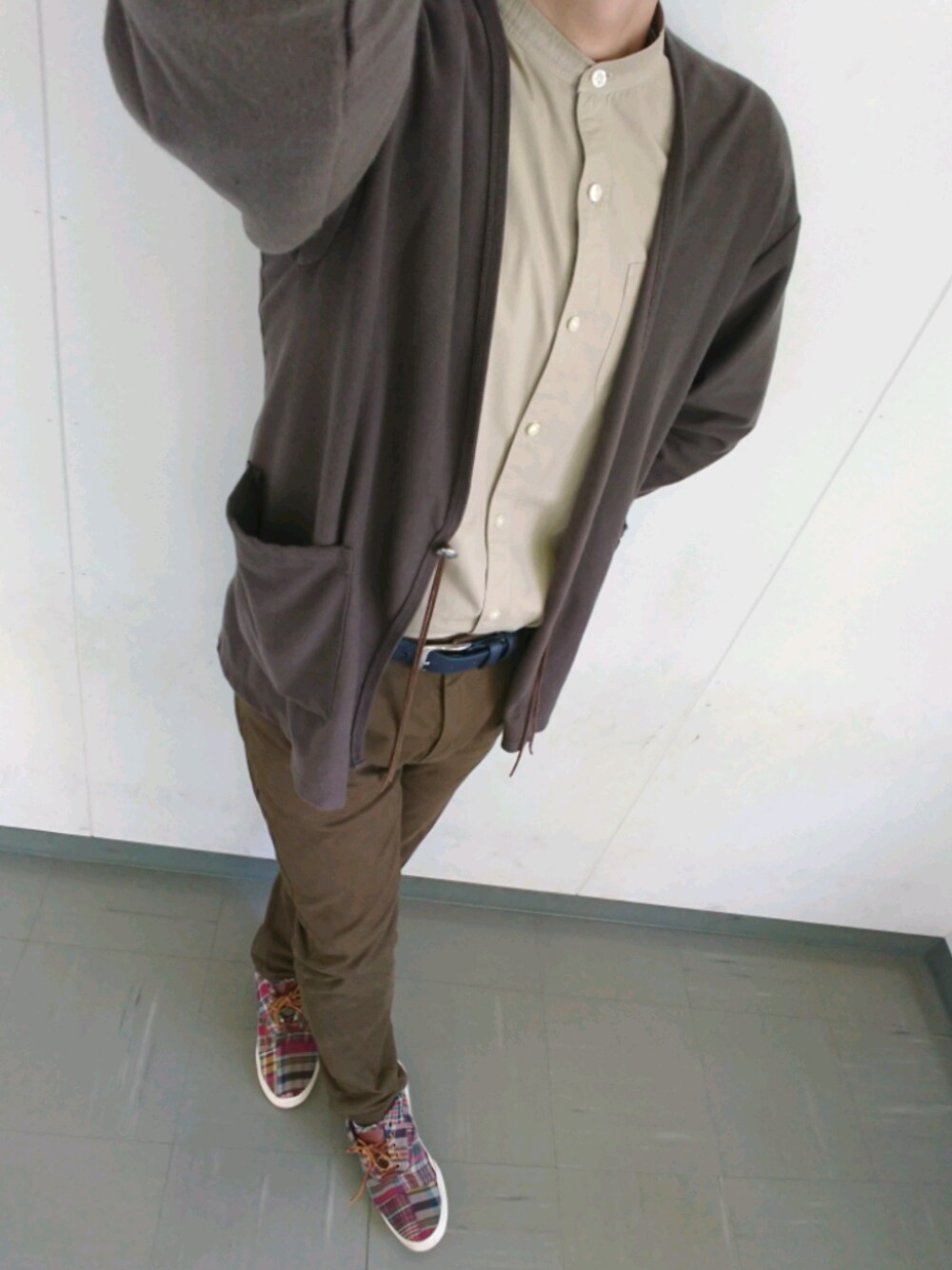 アースカラーの同系色でまとめた カジュアルに寄りすぎてる ビジネスカジュアル