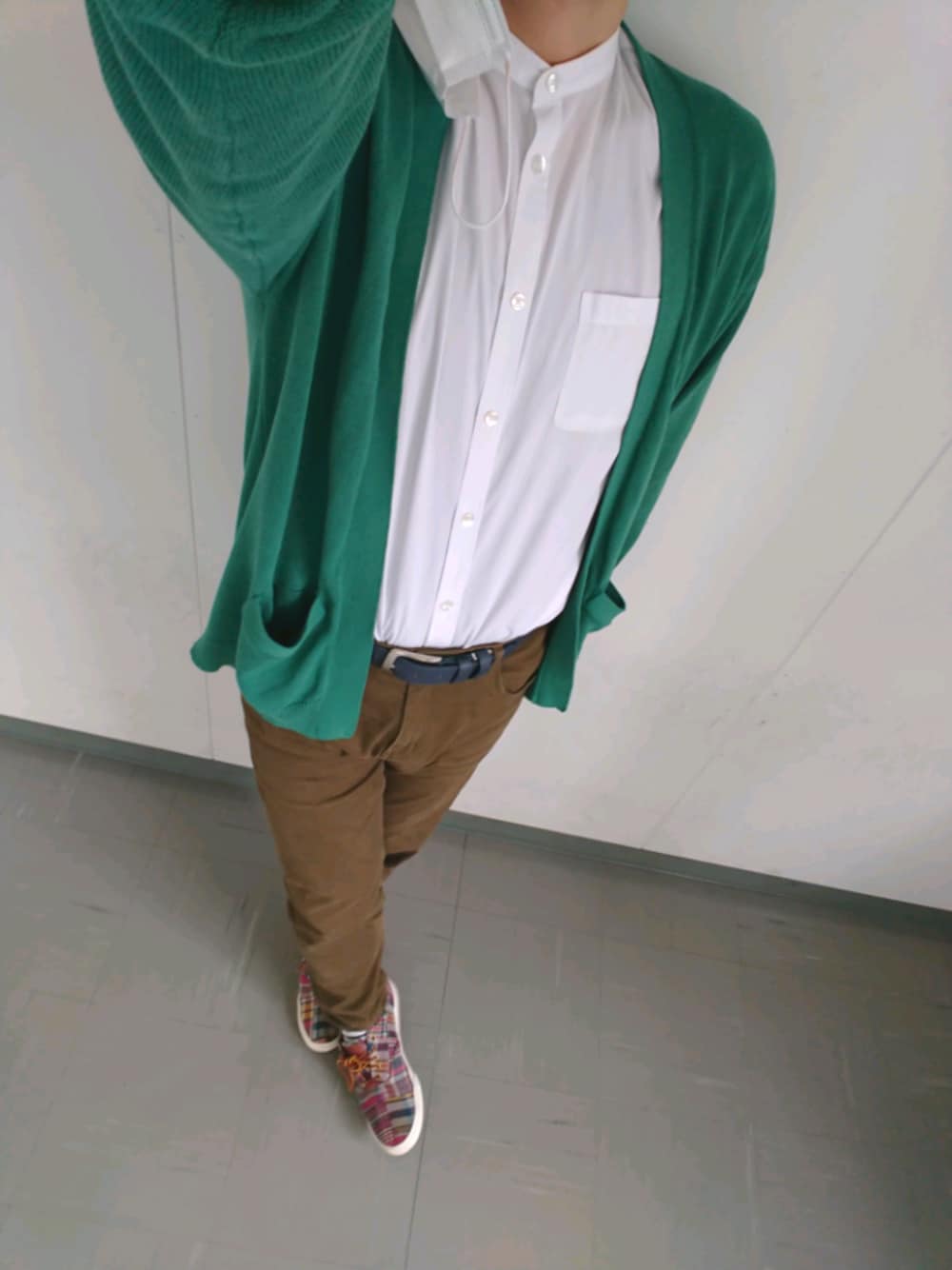 本当は薄いグリーンが欲しかったけど売り切れて代わりに買った濃いグリーンのカーディガン。 まだまだ肌寒い日が多い日のビジネスカジュアル。