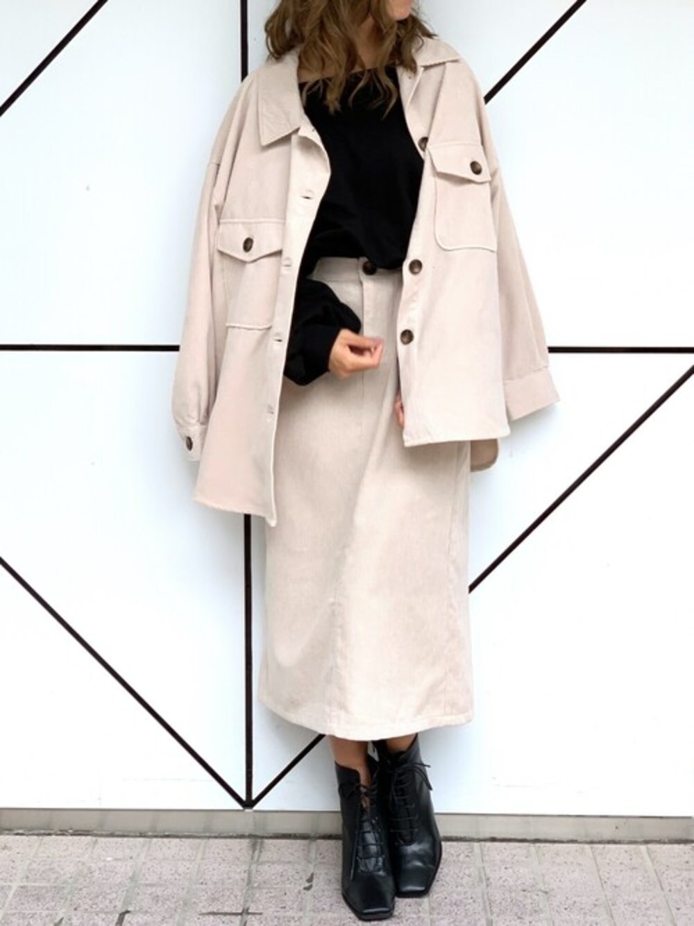 ばさっと羽織るだけで様になる、ビッグシルエットのコーデュロイジャケット 前面に大きく付いたパッチポケットがアクセント!! あたたかみのある表面感のあるコーデュロイ素材です。 細身パンツとも安心してあわせられる、ヒップをすっぽりと隠す着丈。 オーバーサイズのインナーにもストレスなく羽織れるサイズ感◎