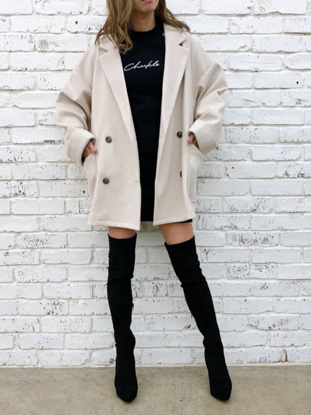 Delyle NOIR STAFFのチェスターコート「ルーズシルエットダブルテーラードジャケットコート」を使ったコーディネート