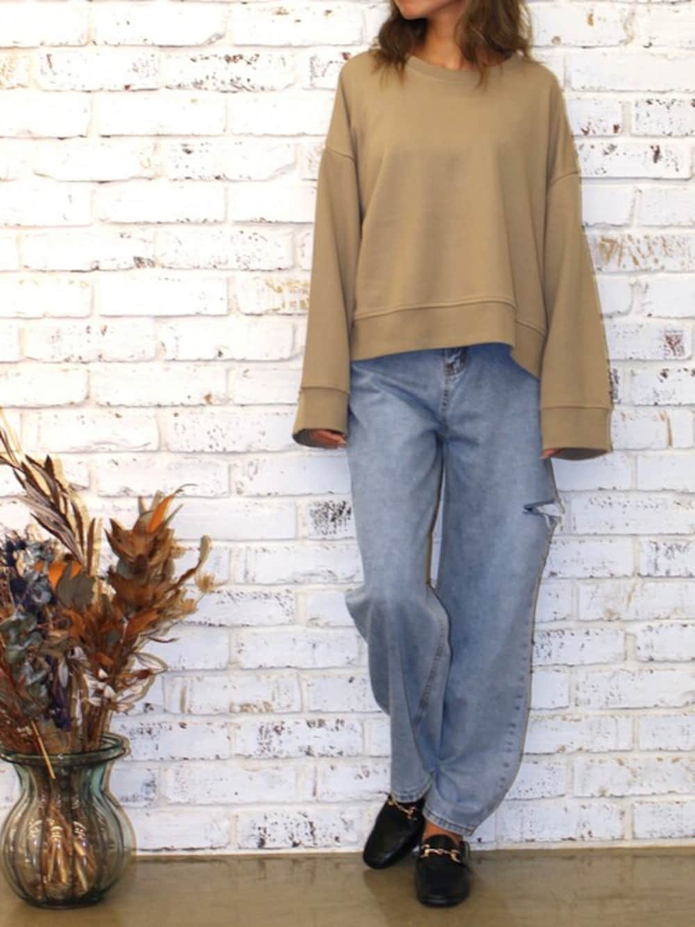 ゆったりルーズなシルエットにサイドスリットが抜け感がプラス♪ 柔らかな裏毛の暑すぎない素材感で長く着用出来ます。 ハリ感のある生地がふんわりシルエット◎ 袖はたっぷりのボリューム感で女性らしさUP♪ スカートからデニムパンツまでオールマイティー着用可能です。