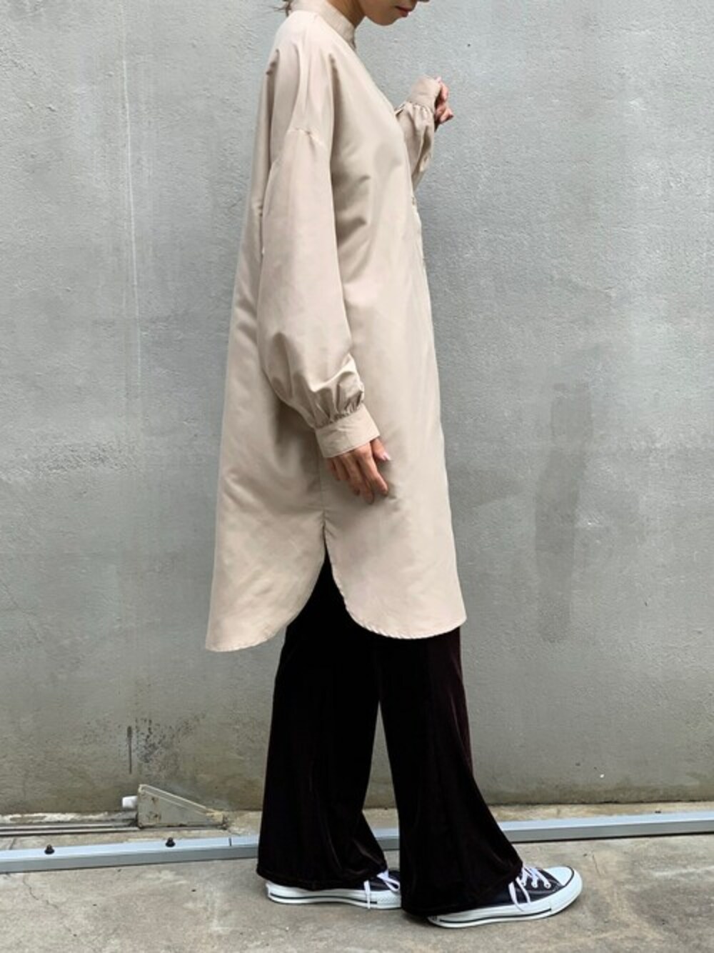 ロング丈でゆるっとした着心地。 楽ちんながらもきちんと感のあるフォルムです!! 両サイドスリットで足さばきが断然よく、ボトムスがさりげにチラ見えする様子がかわいい♪ 上下のボタンをいくつか外したり、全開てにしてジャケットのように羽織るとシンプル装いでもグンと着こなしの幅がぐんと広がります。 ワンピースとしてはもちろん、 前ボタンをすべて閉じて細ベルトでウエストマークしたり、チュニック風に着ても◎