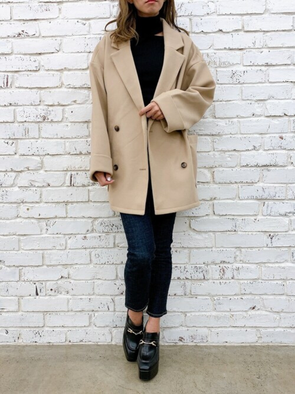 Delyle NOIR STAFFのチェスターコート「ルーズシルエットダブルテーラードジャケットコート」を使ったコーディネート