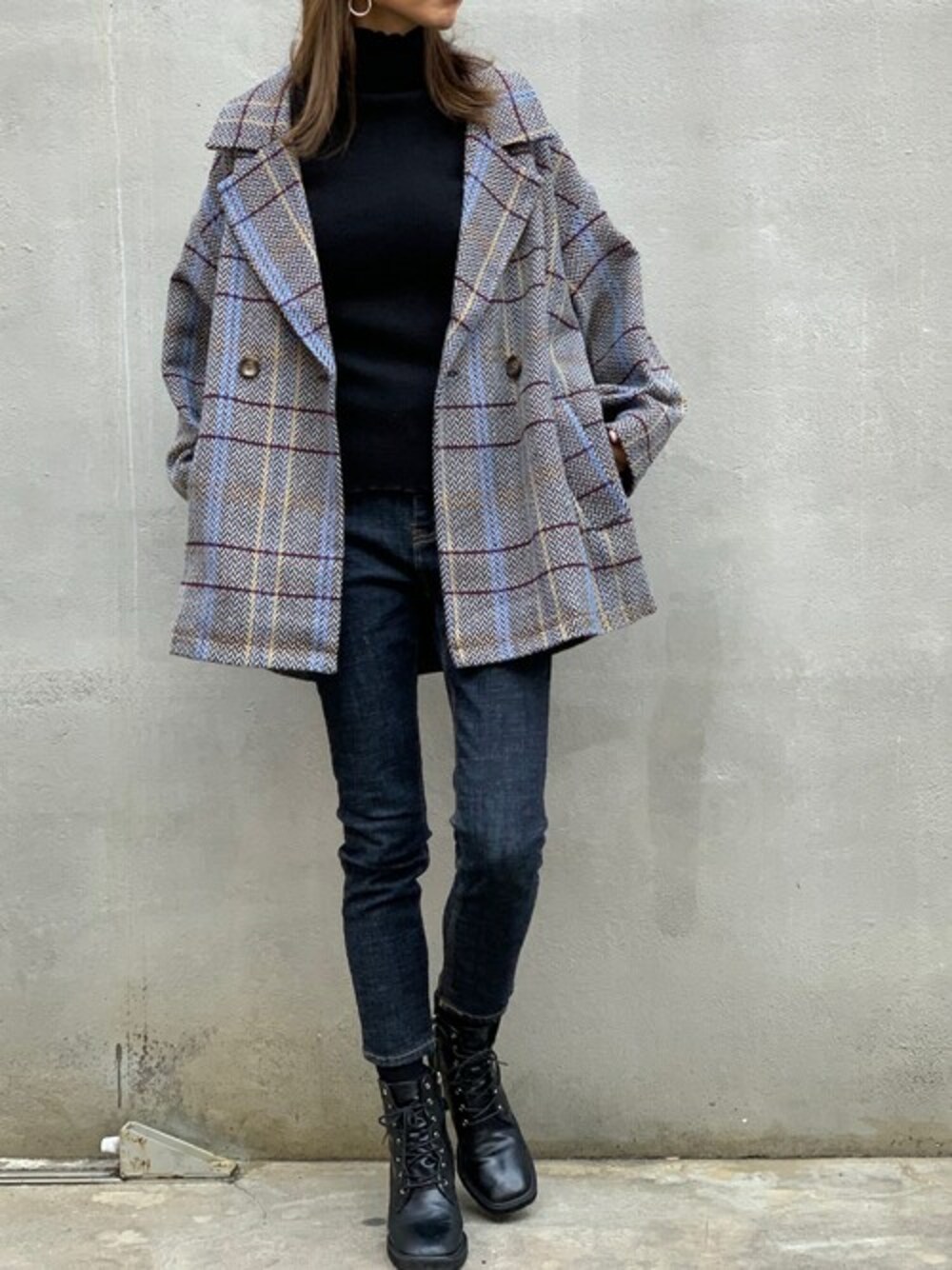 ルーズなシルエットが今年らしい、チェックショートコート♪ カチッとし過ぎない、程良い抜け感が魅力のテーラードジャケット。 着流しのようにさらっと着用できる上にきちんと感も抜かりなく演出できます。 長めの着丈ですっきりとしたシルエットがお洒落な一枚です。