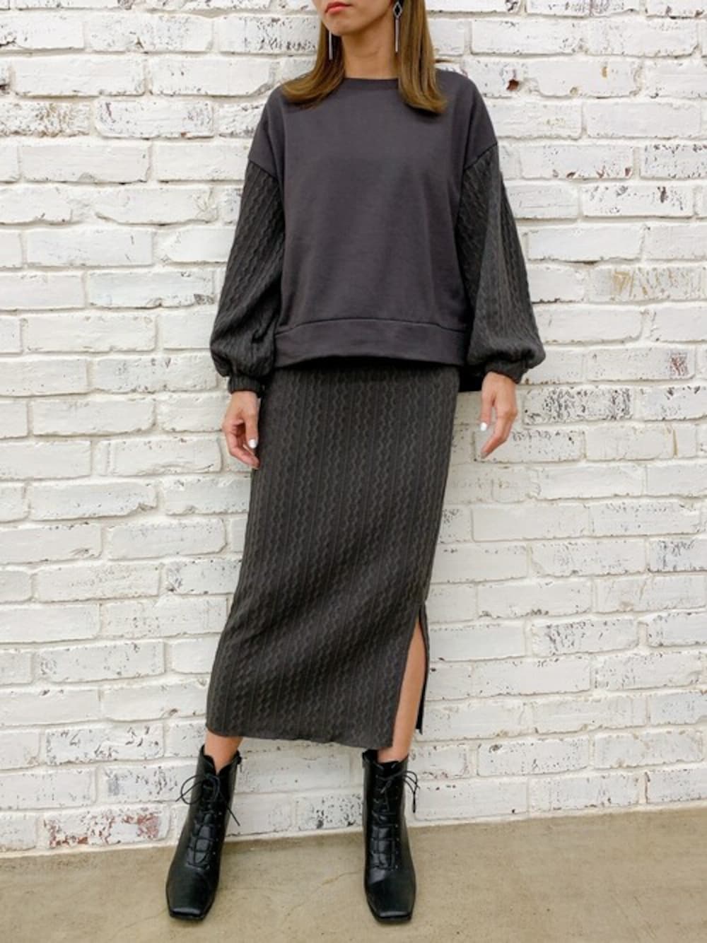 ケーブルデザインの袖と、たっぷりとした身幅でゆったりシルエット。 着丈は長すぎないのでオーバーサイズでもバランスよく◎ 柔らかい裏起毛なので着心地抜群。 真冬でも着ていただけるスウェットです。