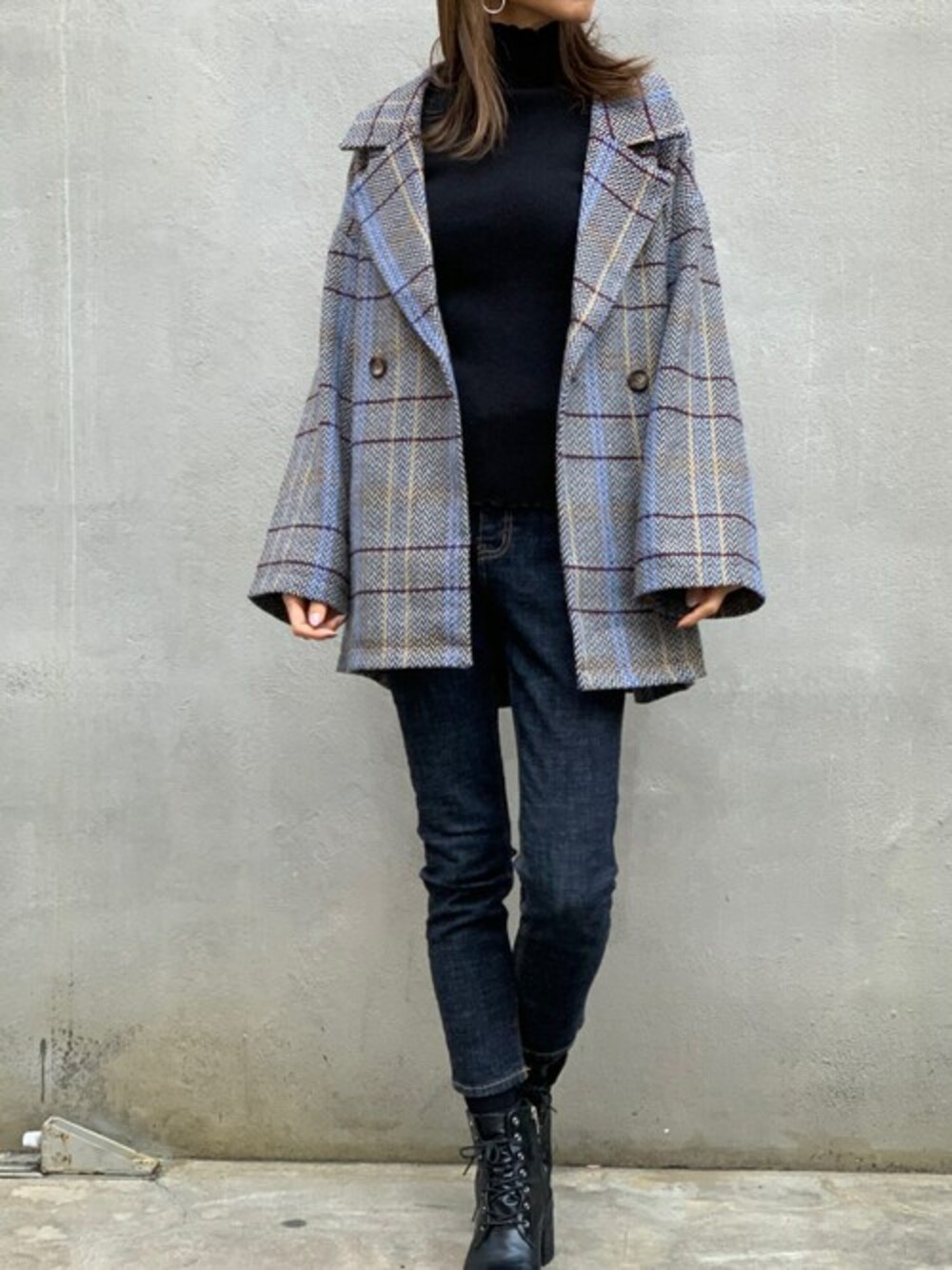 Delyle NOIR STAFFのチェスターコート「ルーズシルエット チェック柄ダブルテーラージャケットコート」を使ったコーディネート