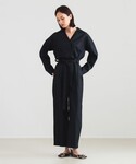 【ジャンプスーツをアレンジ♡】チンツ加工を施し、上品な艶のあるネイビーのジャンプスーツを主役にした、ワントーンコーディネート。 シンプルながらもシルエットの美しさが際立ち、さらりと腰に巻いた袖でこなれ感を演出しました! ふんわりとしたニットがシーズンムードを高め、女性らしさをプラス。小ぶりのバッグとフラットシューズで上品にまとめました^o^ Demi-Luxe BEAMS / 中丸 栞