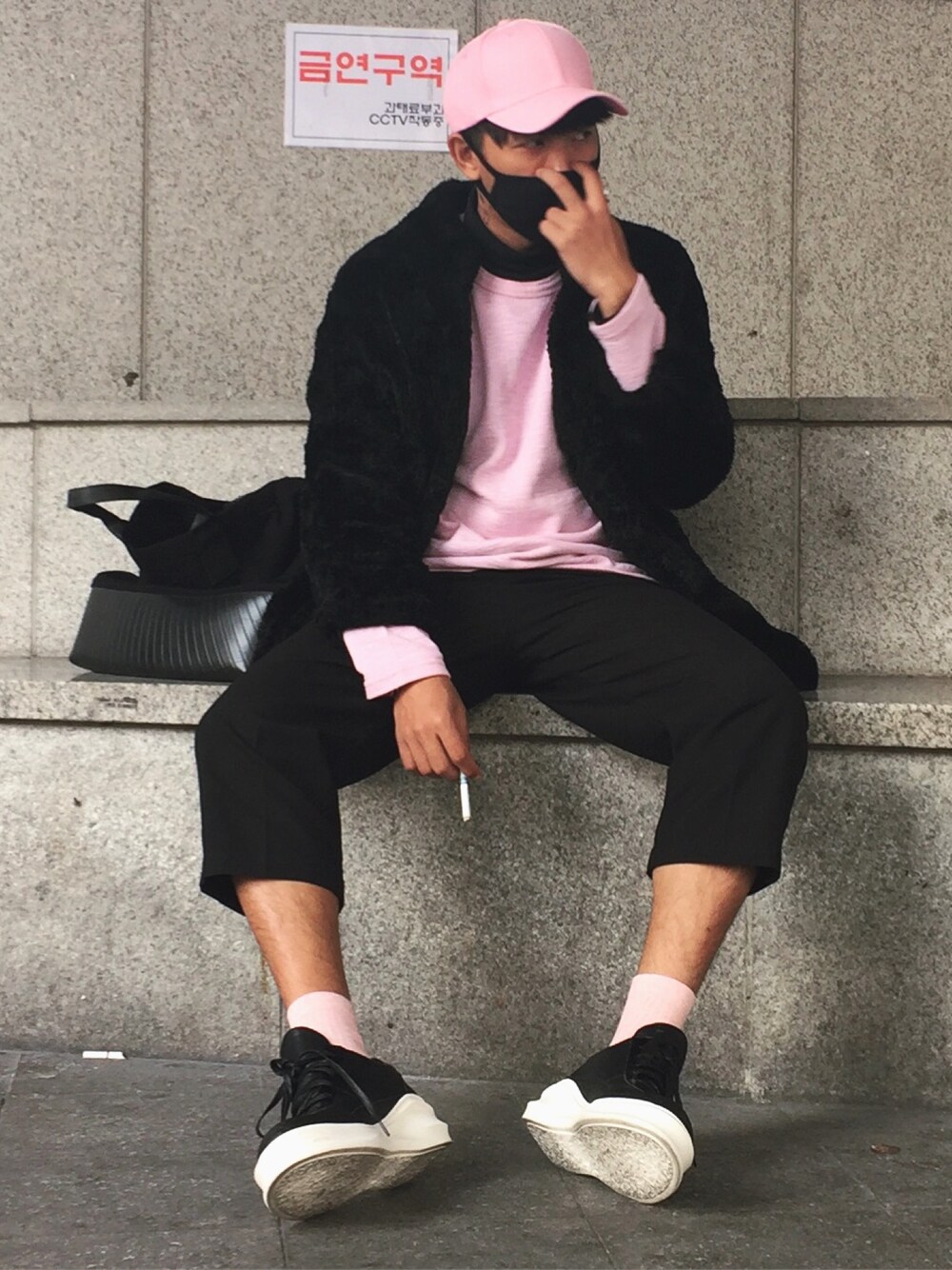 ブラック系のトートバッグを着用したメンズの秋コーディネートの1枚目の写真