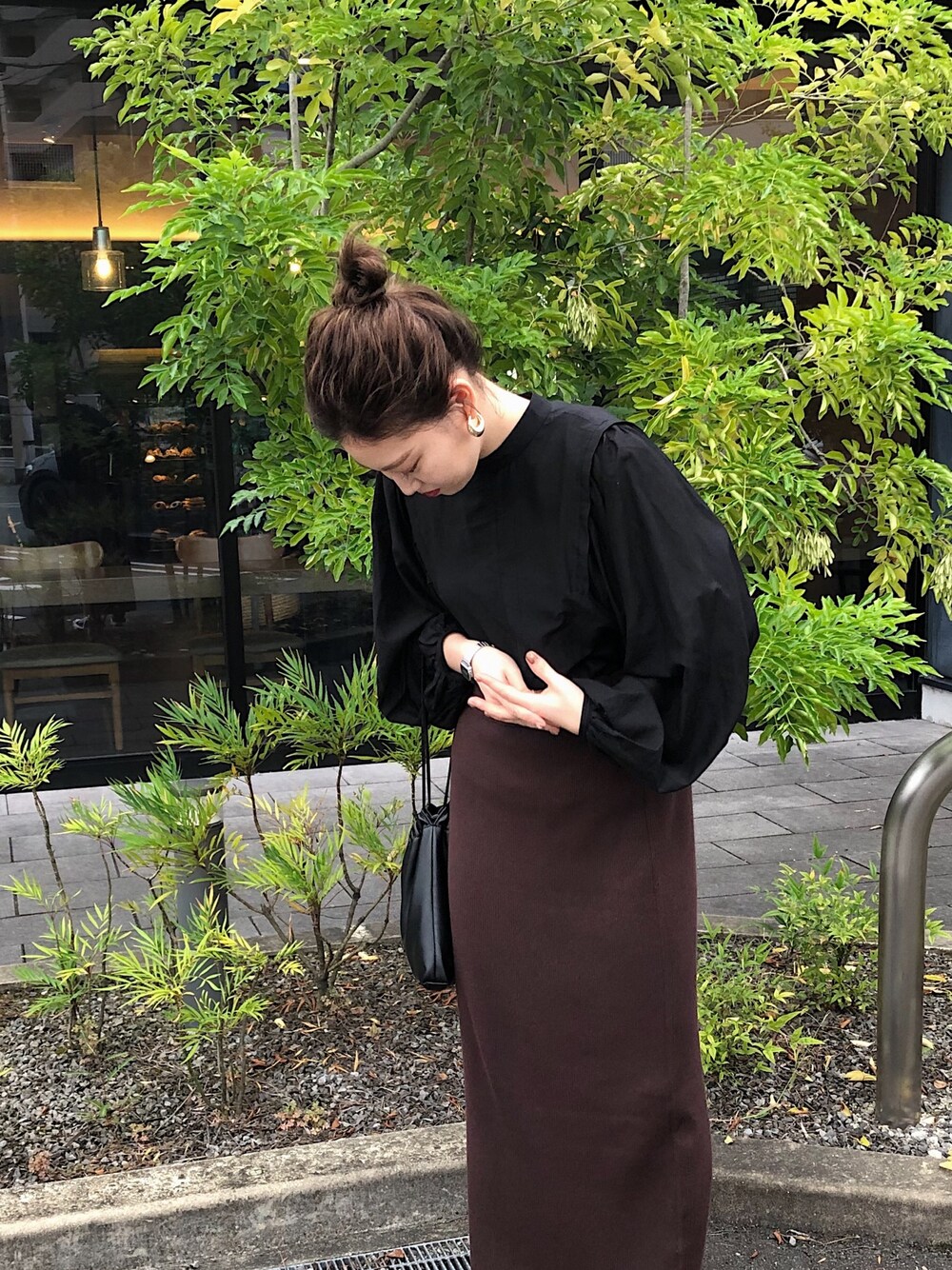 ブラック系のトップス、ブラウン系のスカートを着用したレディースの秋コーディネートの1枚目の写真