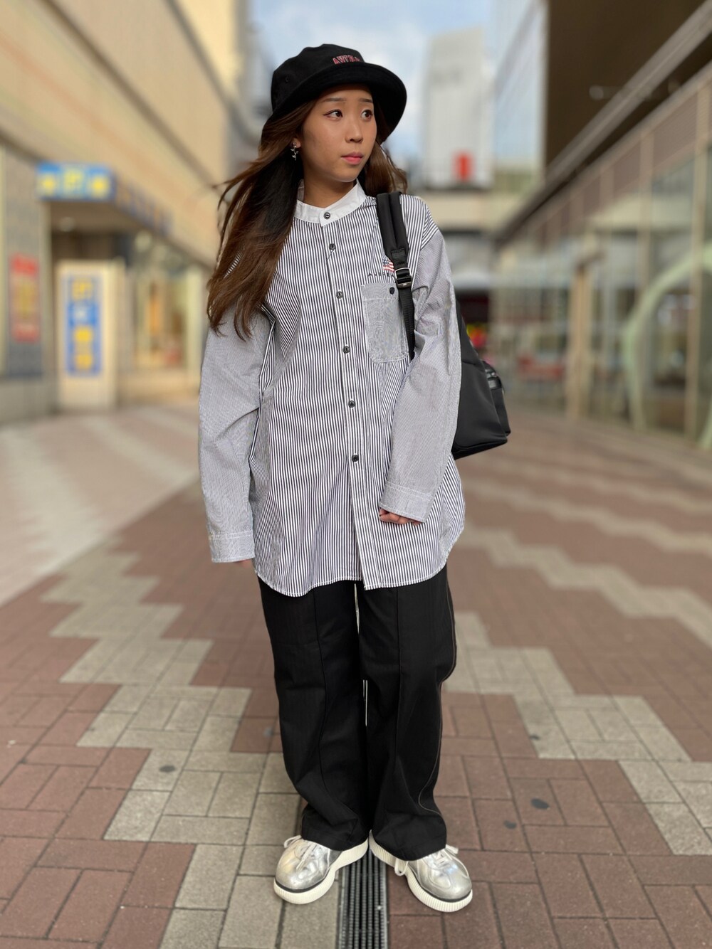 ブラックコーデ! スタッフ:156cm 着用サイズ シャツ:F パンツ:S 帽子:F