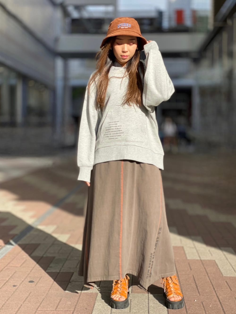 秋コーデ♪ スタッフ:156cm 着用サイズ パーカー:S スカート:F 帽子:F