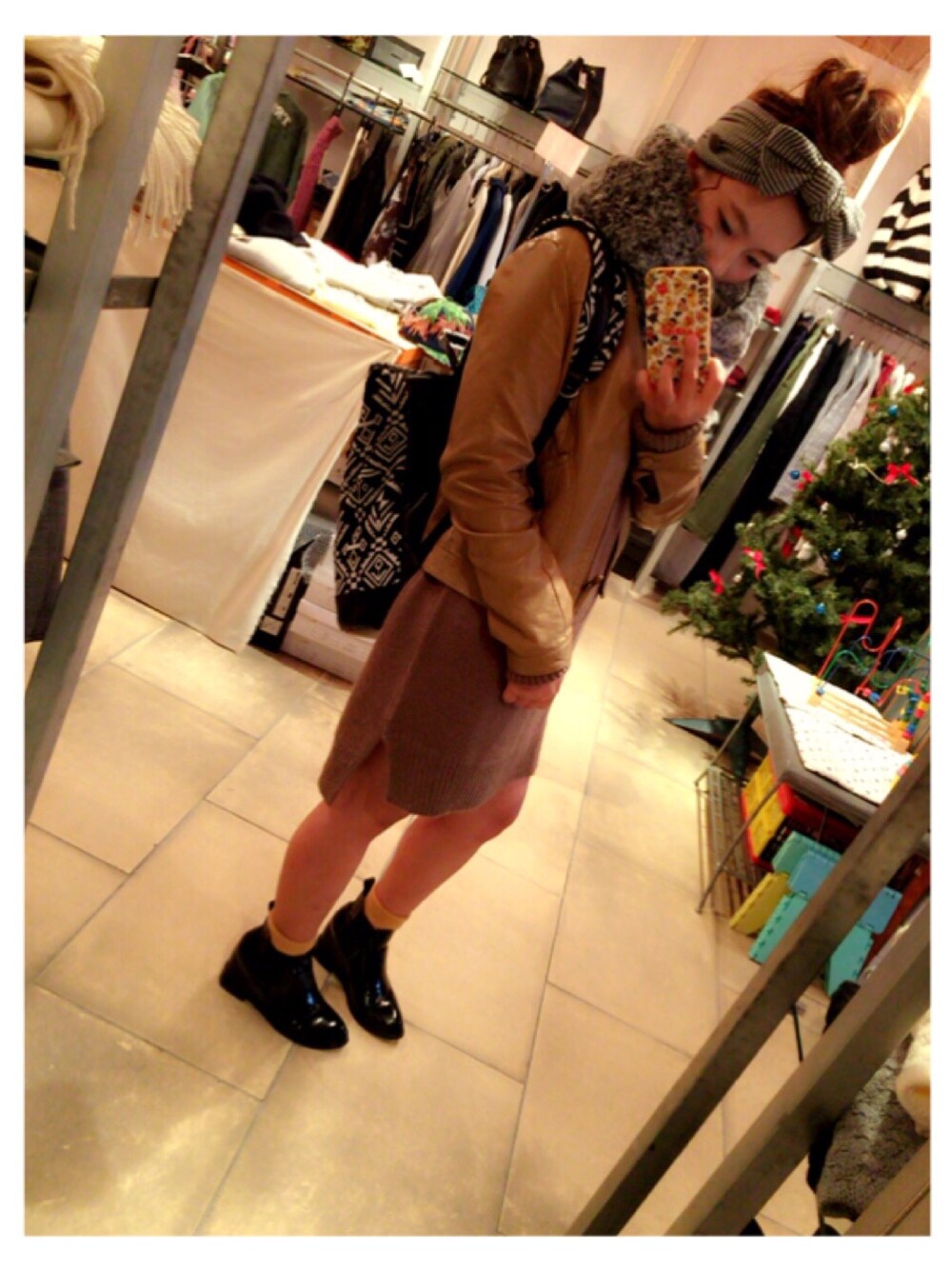 今年トレンドのカーキ色のニットワンピ×キャメル色のレザージャケットで甘辛コーデに♡