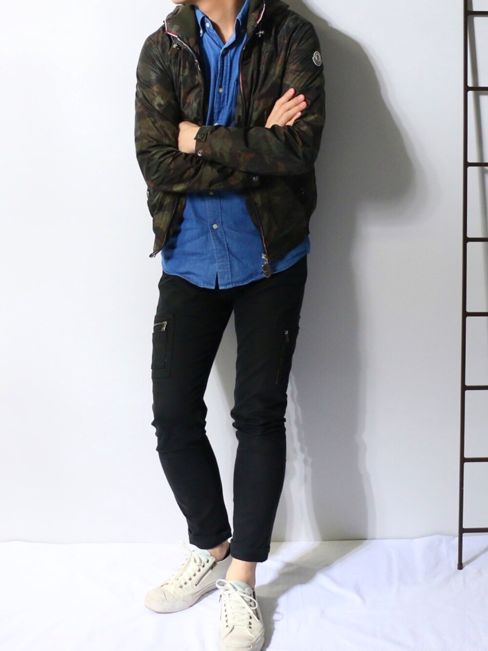 もう何年も着続けるユニクロのデニムシャツ。まだ今年も着れそう! 上は迷彩で下はシンプル!