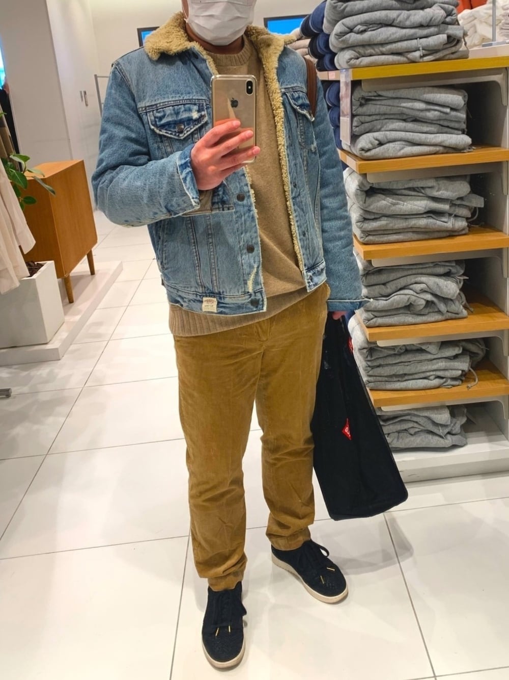記録 UNIQLO +J の行列待ち 朝は寒かったのでニットとボアデニムジャケット。 厚着しすぎですごい暑かった😵