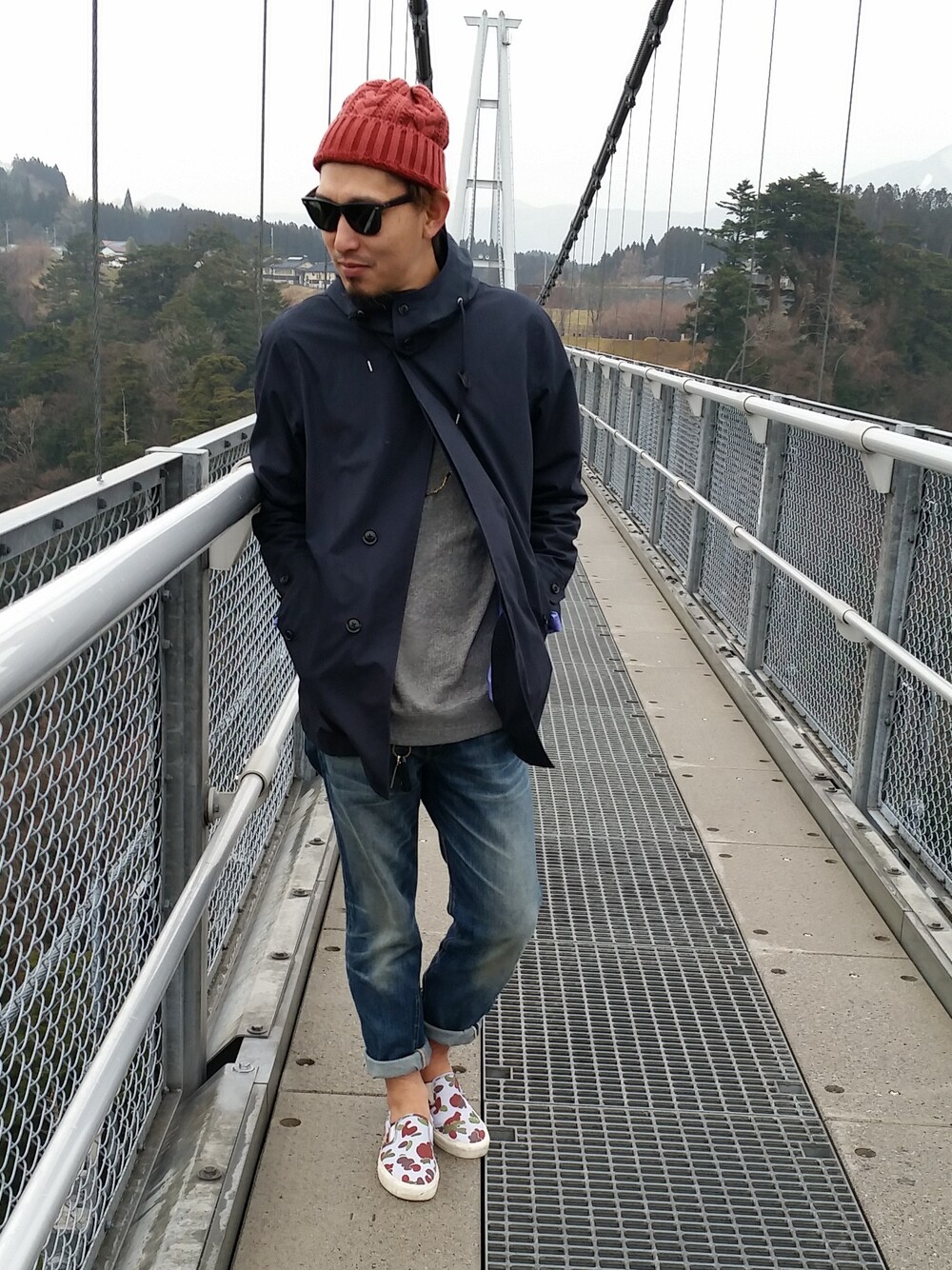 こんにちは。 大分に来ています。 日本一と言われてる吊りばしに来ています。 揺れることもなく、こんな身なりではしゃがへんかと監視されつつ… ほくそ笑みスタイルです。 大分からでした。 よろしくお願いします。