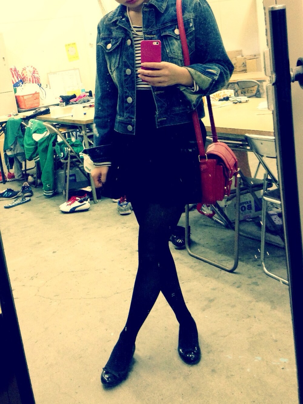 ブルー系のデニムジャケットを着用したレディースの春コーディネートの1枚目の写真