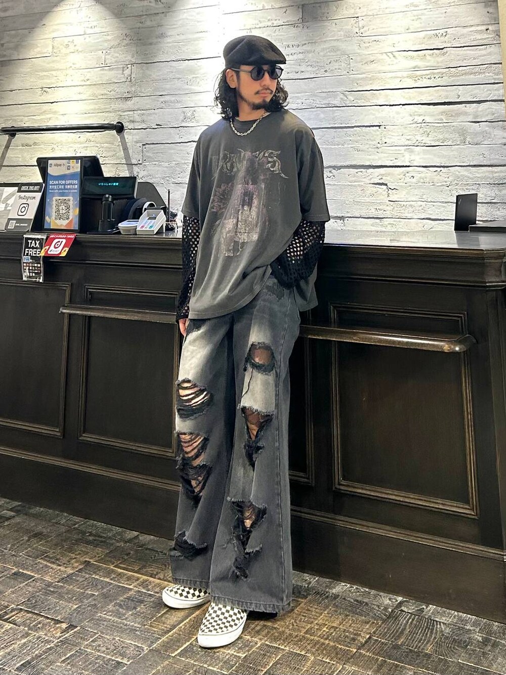 ハレでは少し珍しいバンドTを使ったモノトーンコーデ。 バンドTでは珍しい少し緩めのシルエット。 ボトムをダメージジーンズで合わせたロックスタイルに。 インナーにシアーTを入れ、色味を統一することで少しモードな雰囲気もプラスしてます! ダメージデニムと合わせてルードな印象に!