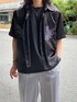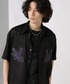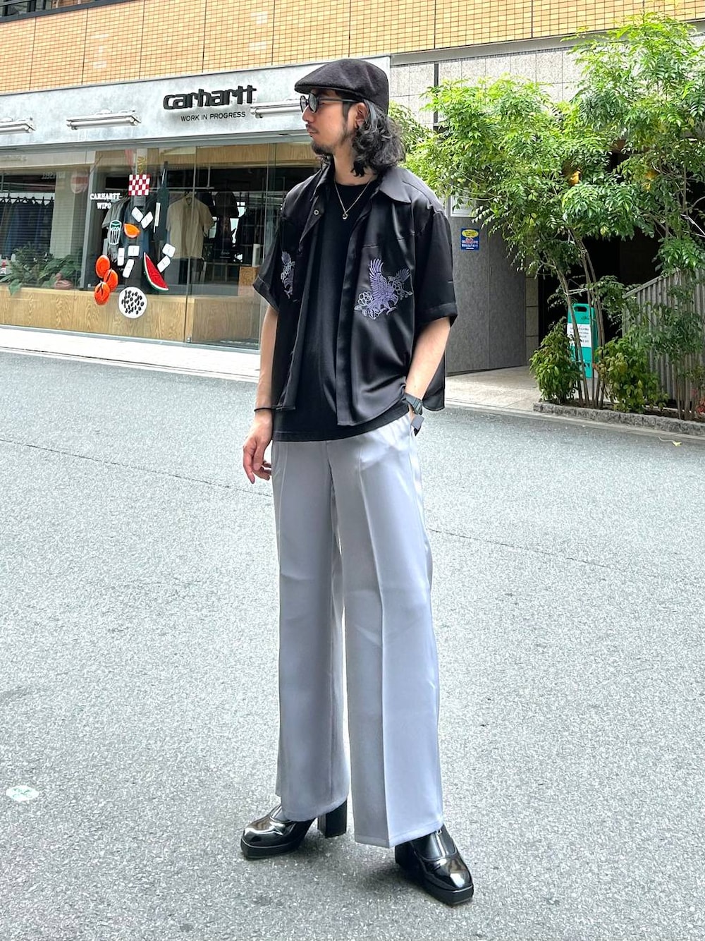 ハレらしいシックなデザインシャツを使ったモノトーンコーデ。 シャツは肩落ち、短丈のシルエットです。 スカジャンの様なデザインに、光沢あるサテン素材が渋さと上品さを出してくれます! 羽織で着ても閉じて着ても雰囲気出るので好きな着方を! 定番のトロミパンツと合わせてキレイめスタイリングに。