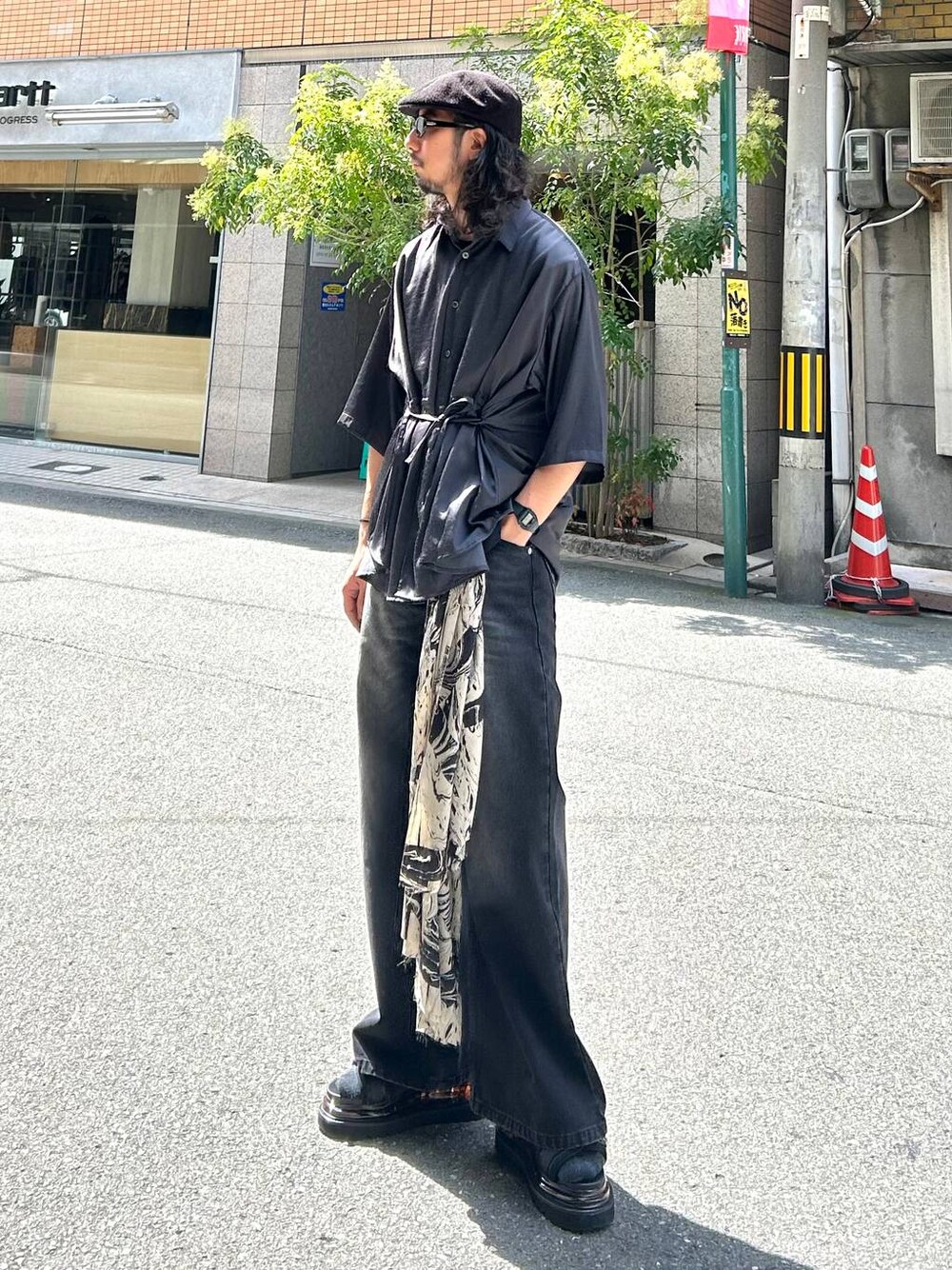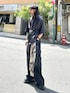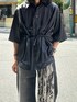ハレらしいデザインシャツを使ったモノトーンコーデ。 シャツは光沢感ある上品なつくりです。 腹部の紐を引っ張ることでシルエットを変えれるので、その日の気分で雰囲気を変化させれます! ラフに着たい方はそのまま着るのがオススメです! 紐を引っ張ると、腹部が締まるので脚長効果が出ます!