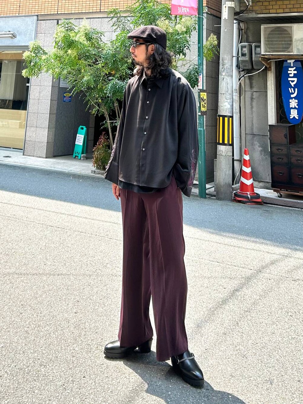 人気のDABOシリーズを使ったキレイめコーデ。 今回はDABOシリーズからの初の刺繍シャツです! バックと袖口に大胆に刺繍デザインを施しており着るだけでお洒落+上品な印象に! DABOという事もありシルエットはかなり緩めです! 定番のトロミパンツ店舗も再入荷してます! 暑い夏活躍間違いなしです!気になる方是非!