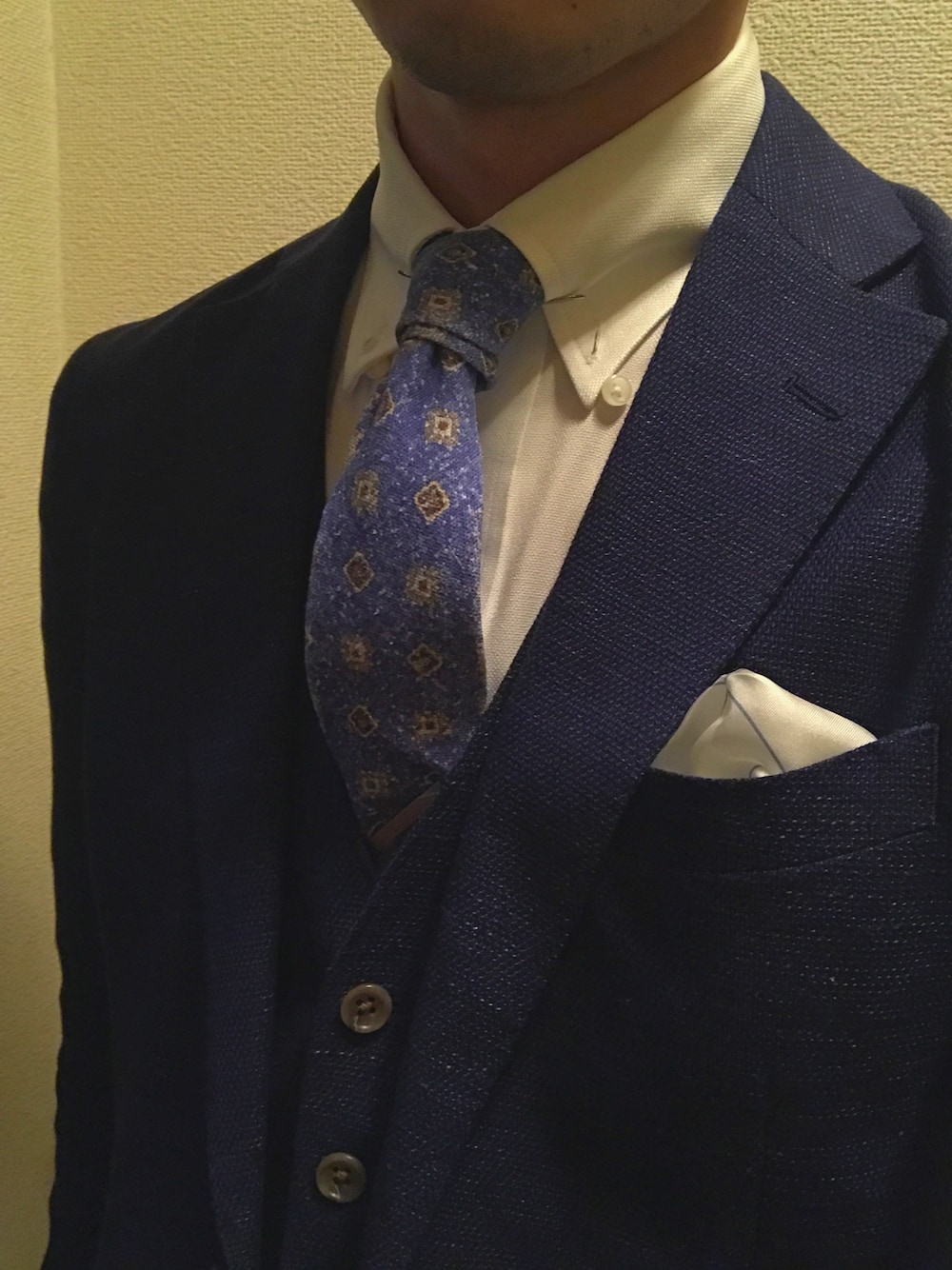 いい感じのメランジ生地のジャケットに、イタリア産ヴィンテージタイ。 タイバーいい感じ。