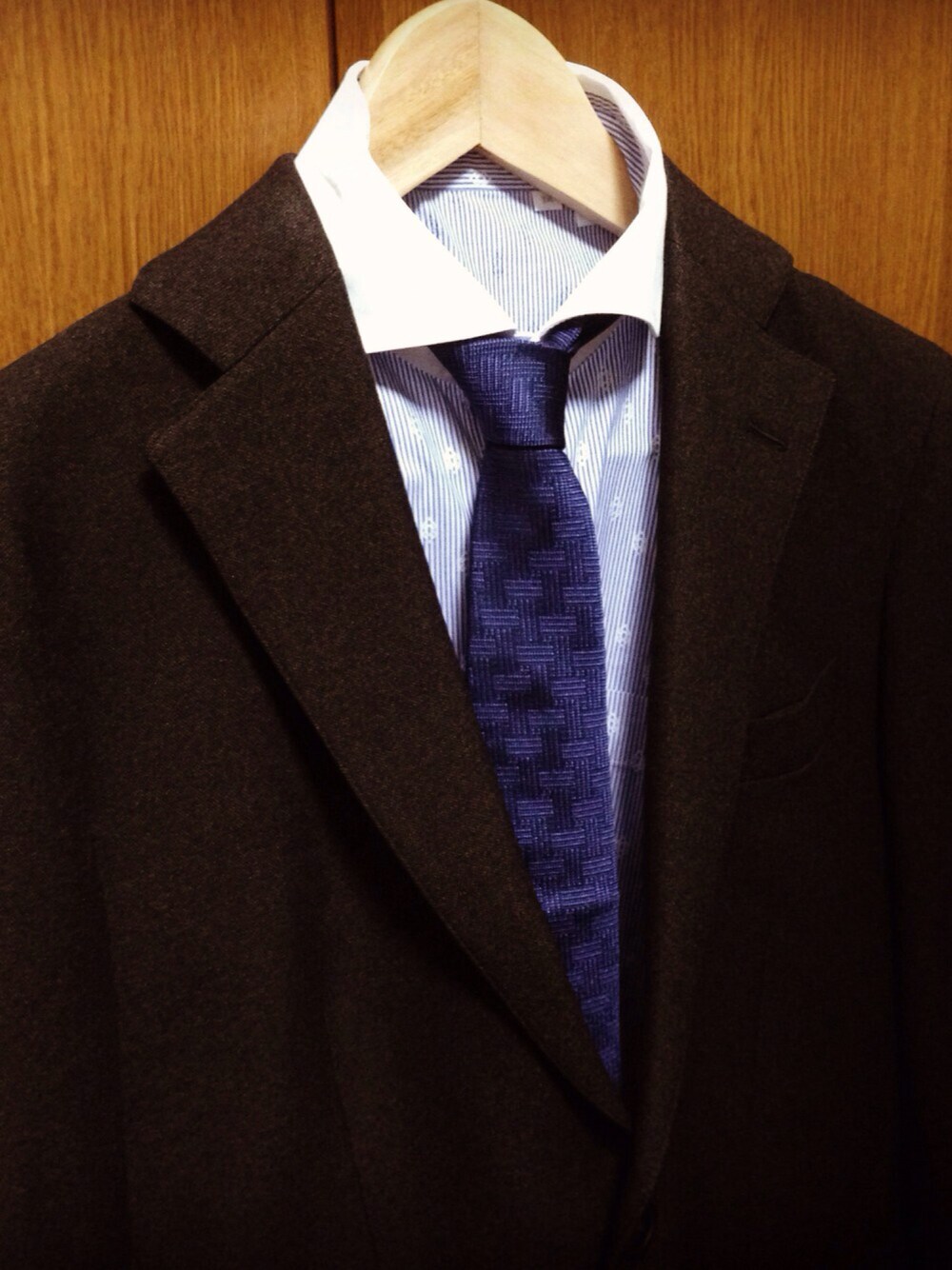 これこそアズーロエマローネなんじゃないかコーデ ダークブラウンJKT。おっさん臭さ最高だから、クレリックとか細めのタイでの若づくり必須。 ブラウンは流行だけど、ネクタイくらいに止めるのが丁度いいかも。